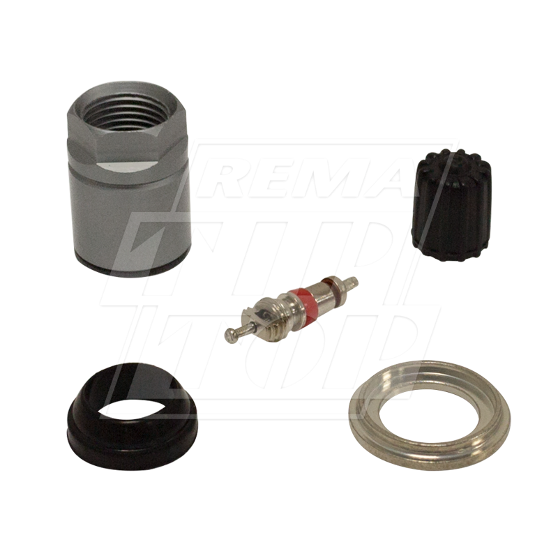 A box of 10 service kits, with each including: 1 nut, 1 rubber grommet, 1 plastic washer, 1 valve cap and 1 valve core.