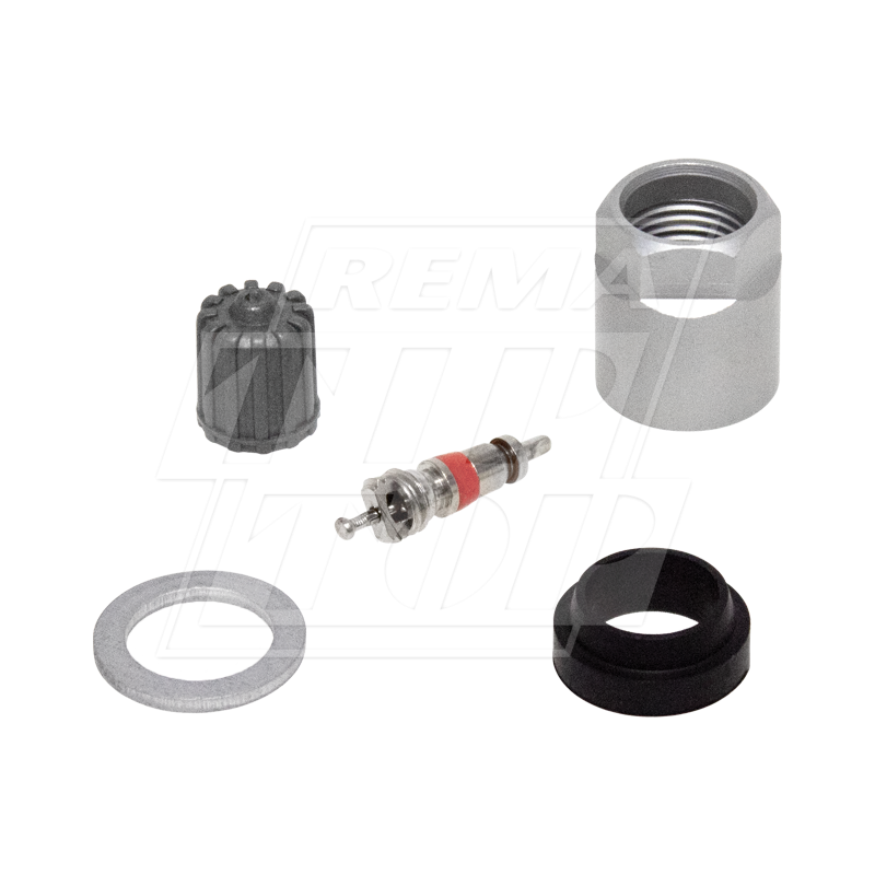 A box of 10 service kits, with each including: 1 nut, 1 rubber grommet, 1 plastic washer, 1 valve cap and 1 valve core.