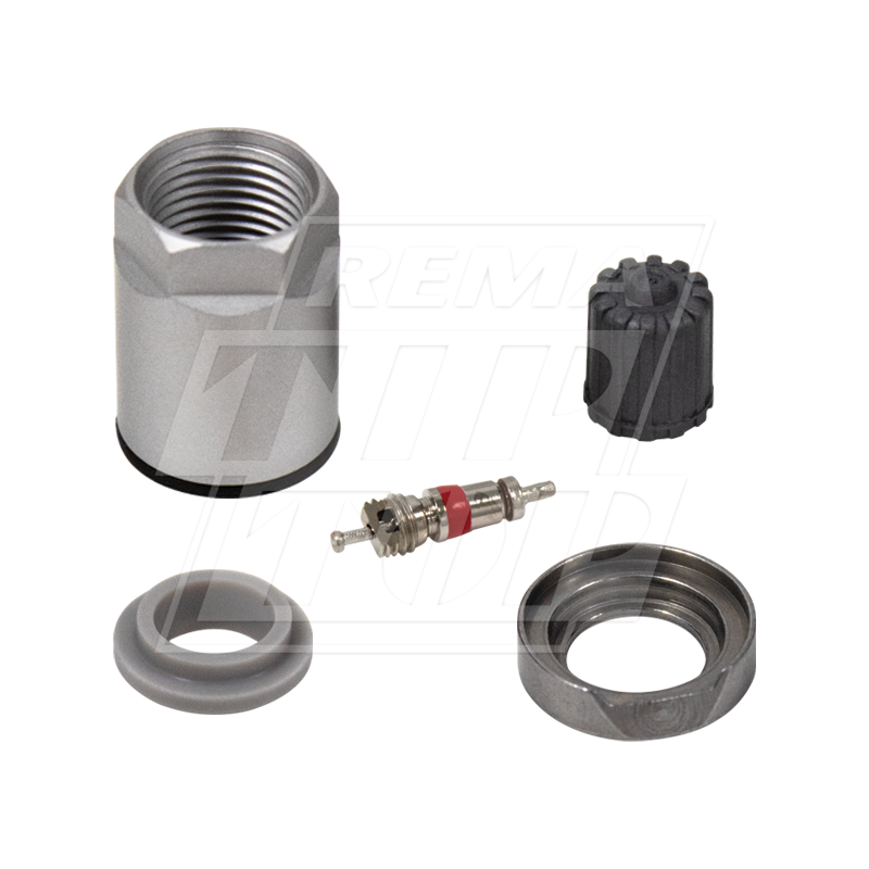 A box of 10 service kits, with each including: 1 nut, 1 rubber grommet, 1 plastic washer, 1 valve cap and 1 valve core.