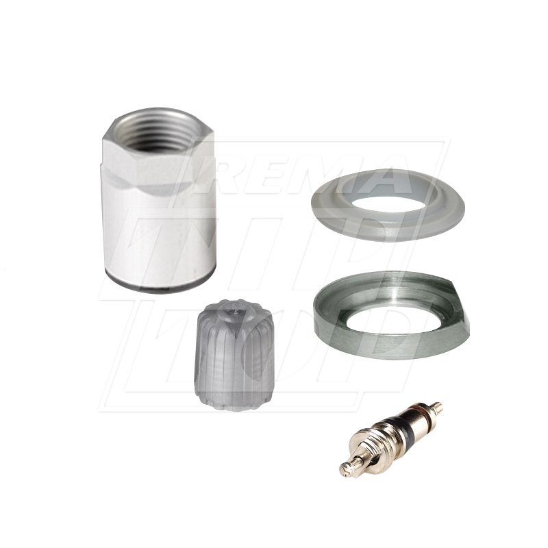 A box of 10 service kits, with each including: 1 nut, 1 rubber grommet, 1 metal washer, 1 valve cap and 1 valve core.