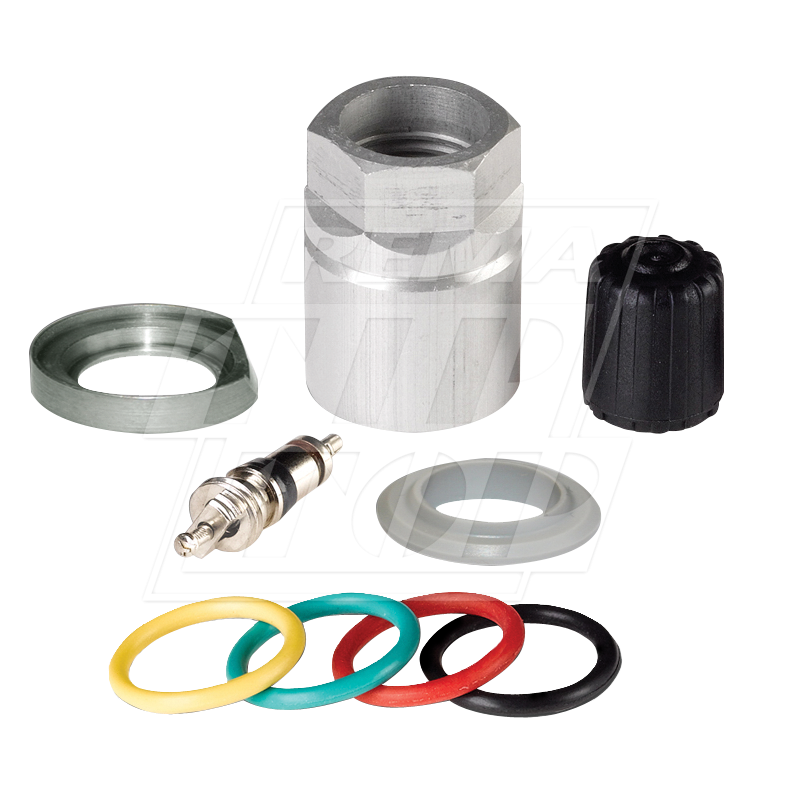 A box of service kits, with each including: 1 nut, 1 rubber grommet, 1 plastic washer, 1 valve cap and 1 valve core.
