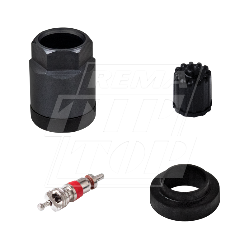 A box of 10 service kits, with each including: 1 Graphite Nut, 1 Rubber Grommet, 1 Plastic Washer, 1 Valve Cap and 1 Valve Core.